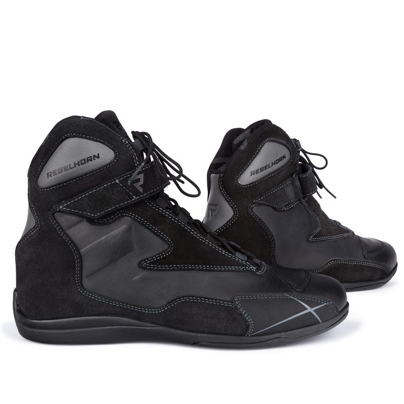 Rebelhorn Spark-это мотоботы на шнуровке со спортивным характером. Они оснащены системой для быстрой шнуровки и снятия обуви. Эластопановый протектор лодыжки обеспечивает комфорт при езде и комфорт при ходьбе и защищает ногу в случае опасности.